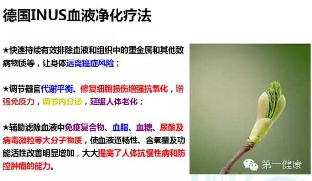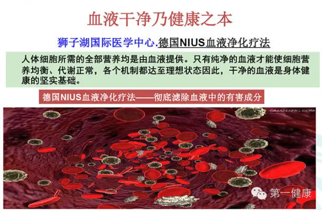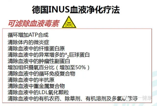因为中国的空气污染、土壤污染、水污染、食品污染特别严重,99%的中国人血液中毒,所以现在亚健康、肿瘤、癌症等各种疾病的发病率特别高。我们引进的德国INUS血液净化疗法,只需要2个多小时就可以把血液中的重金属、农药残留、免疫复合物、胆固醇、甘油三脂、过敏因子、尿酸等大分子毒素排出体外,远离癌症风险;调节器官代谢平衡、修复细胞损伤增强抗氧化,增强免疫力,调节内分泌,延缓人体老化;时间短、疗效快、直观可见。