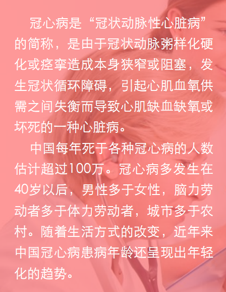 中国每年死于各种冠心病的人数估计超过100万。冠心病多发生在40岁以后,男性多于女性,脑力劳动者多于体力劳动者,城市多于农村。