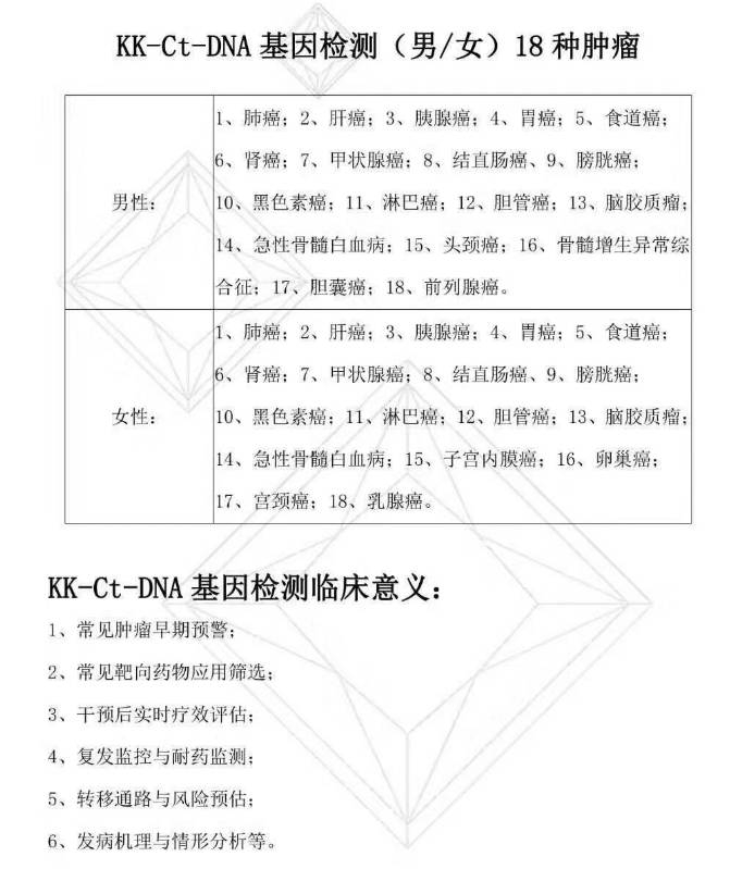 第一健康与双科国际强强合作,特面向第一健康贵宾推出能检测18种肿瘤的KK-Ct-DNA基因检测。