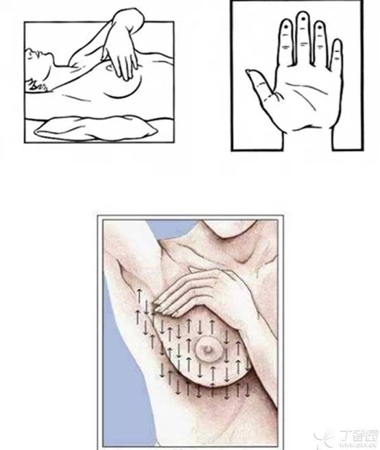 触摸手法如图所示,主要是感觉乳房的质地,有没有硬块出现。平躺在床上,抬起待检侧的胳膊,用另一侧的食指、无名指和中指,在乳房区域小幅度地上下、上下地触摸,看有没有肿块存在。