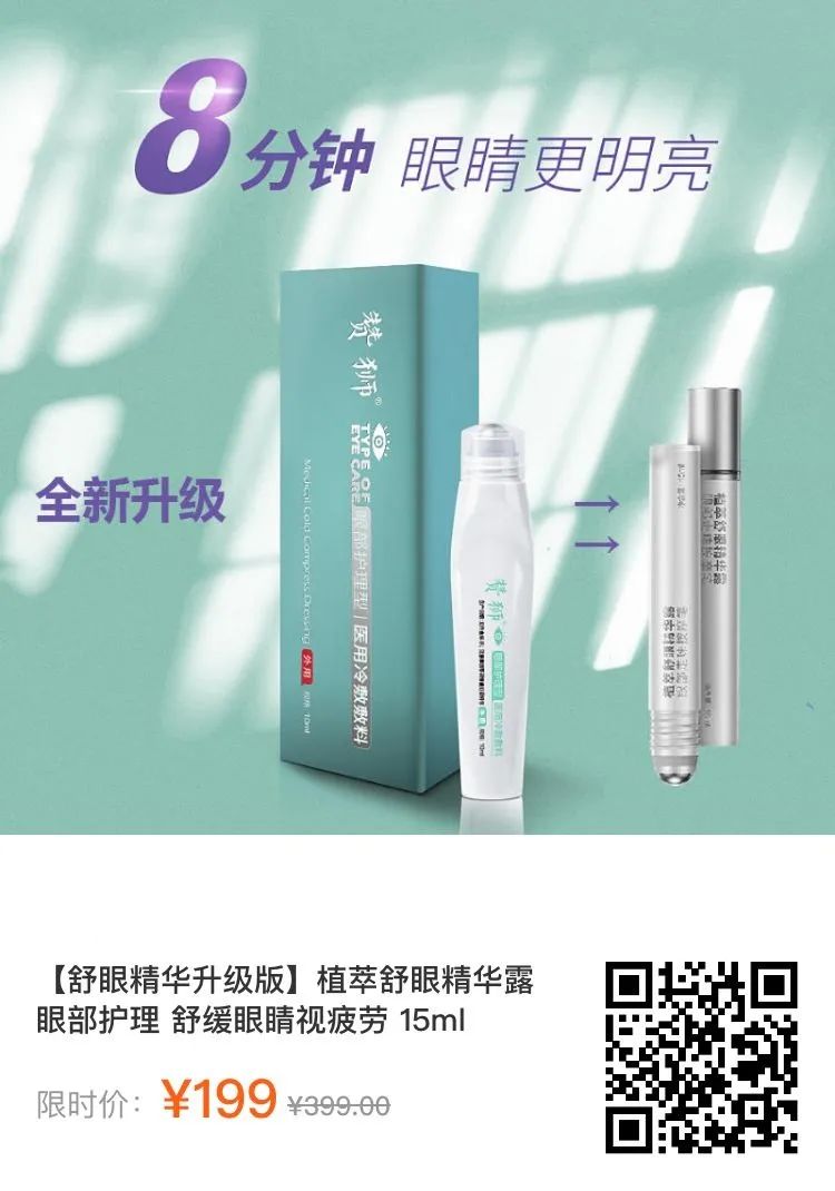 如果通过以上方法,你的症状仍然没有改善,或者你现在症状已经明显到影响你的工作和生活了,那么你可以考虑在包里备上一支舒眼精华来改善眼部疲劳,如这款【舒眼精华升级版】植萃舒眼精华露,萃取多种植物精华,滚珠设计,可以边涂抹边按摩眼周、促进精华吸收,同时释放多重修护成分激活泪腺分泌,促进眼周血液循环,缓解用眼过度带来的视疲劳。