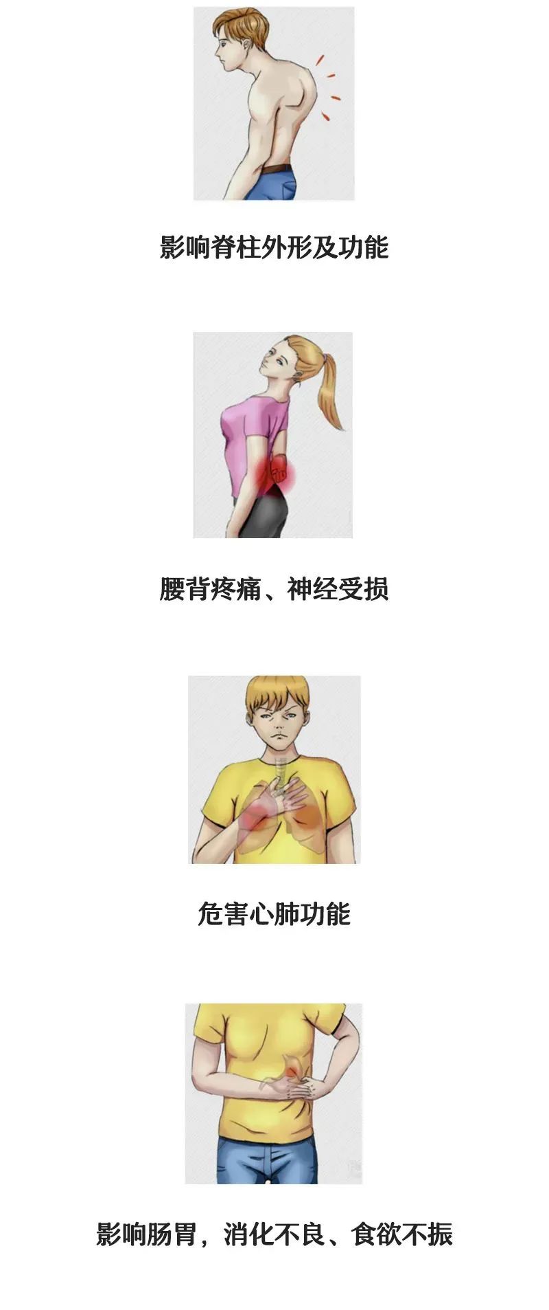 脊柱侧弯逐渐加重,外形变化就会显现出来。外形的异常,会导致心理自卑,影响人际交往,久而久之出现心理障碍。