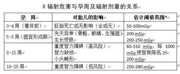 动物实验及回顾性临床资料显示,造成胎儿不良结局的最低辐射暴露剂量通常为50-200mGy,大剂量的暴露(>1Gy,1Gy =1 000 mGy)才容易导致胚胎死亡,临床上造成生后严重智力障碍的最低暴露剂量是610mGy。