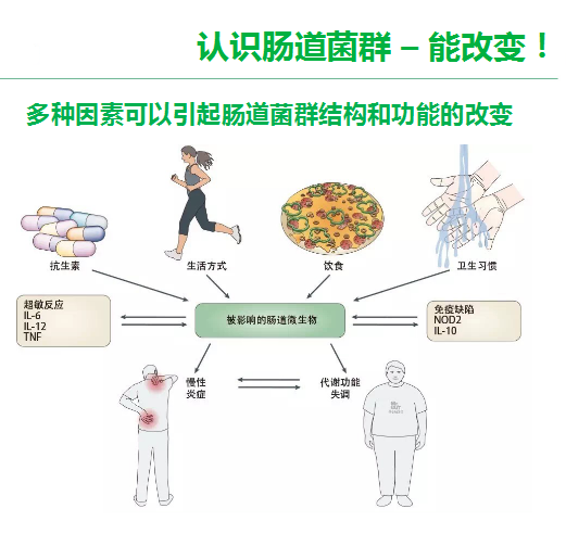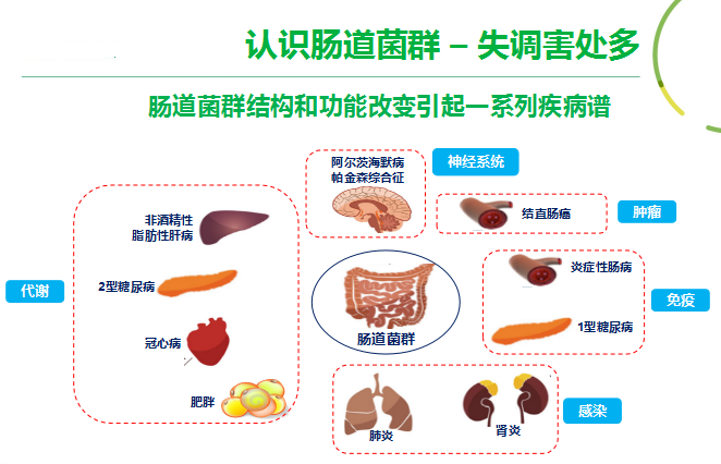 正是因为这些因素导致了肠道菌群结构和功能的改变,进而引发一系列疾病谱。我们发现,这些疾病涵盖了人体的多个方面,其中,