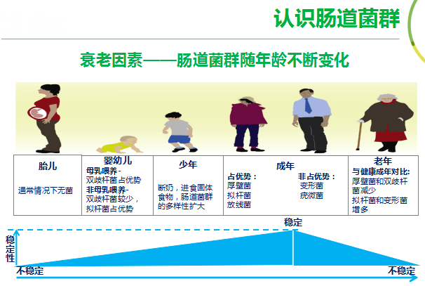 研究者发现,年龄,也就是衰老因素,可以直接影响肠道菌群的变化。图中我们可以看到,胎儿时期通常情况下是无菌的状态,接着从婴幼儿、少年的不稳定状态一直过转变到成年时的稳定状态,此时出现了优势菌群如厚壁菌门、拟杆菌门和放线菌门。随着年龄继续的增长,又由稳定状态转变为老年的不稳定状态,主要表现就是厚壁菌门和双歧杆菌丰度减少,拟杆菌们和变形菌门的丰度增多。