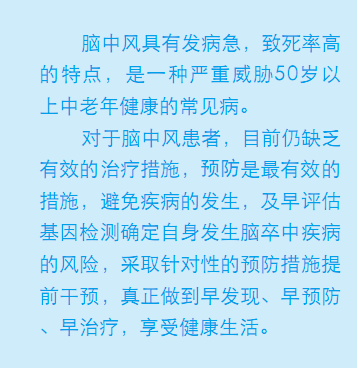 脑中风具有发病急、致死率高的特点,是一种严重威胁50岁以上中老年健康的常见病。目前仍缺乏有效的治疗措施,预防是最有效的措施。第一健康为客户提供中风基因筛查服务。