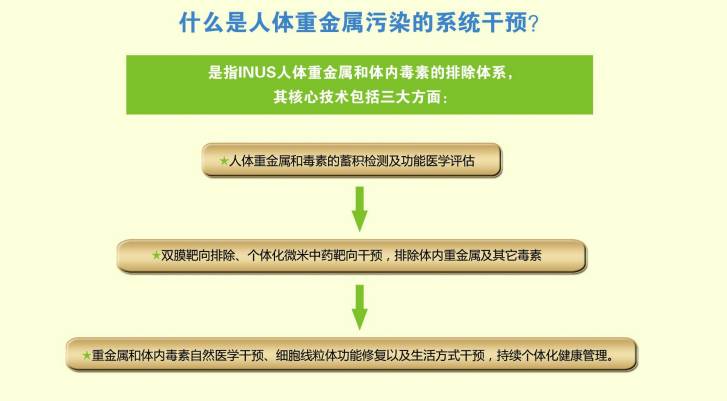 德国INUS的人体重金属双膜靶向清除技术,通过九大层级排除通过饮食、环境进入人体内的有害重金属,同时保留人体必需的微量元素,对人体正常机能毫无影响,是目前国际上最先进的相关疾病靶向干预技术,其拥有独家专利的纳米超离子交换纤维膜,可将人体内蓄积的重金属靶向隔离、收集并排出体外,与传统的重金属络合剂清除法相比,具有见效快、疗效久、安全可靠、微量元素保留等显著优势。