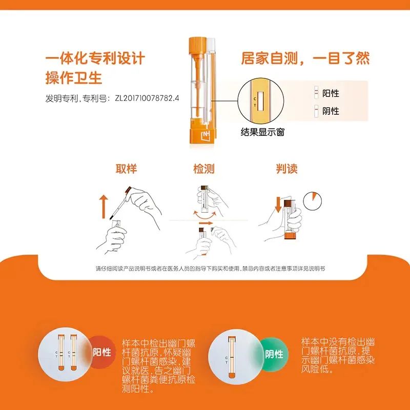 幽幽管首次实现取样和检测“验孕棒”式一体化设计依靠粪便幽门螺杆菌检测技术,可以通过检测粪便样本中是否存在幽门螺杆菌抗原判断感染。从取样,检测到结果判读都能一管搞定不但干净卫生,而且操作十分简单,无痛无创,检测前无需服药,检测时无需空腹,对样本采集无特殊要求,采样后将取样棒插回试剂管,10秒摇匀,按下管盖后10分钟即可读取结果。