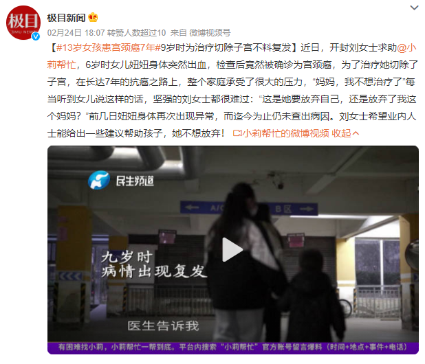 不久前,某浪一则新闻#13岁女孩患宫颈癌7年 引发了广大网友的关注。在采访中女孩的妈妈介绍道,小女孩儿是在6岁那年,突然出现下体不规则出血,经过多方面的检查确诊为宫颈癌。再经过化疗、放疗、定期检查等系列治疗后,病情也趋于稳定。但没想到的是,仅过了三年妞妞9岁时病情复发导致子宫被切除。而就在一家人以为一切都在慢慢变好的时候,孩子的病情却再次复发...