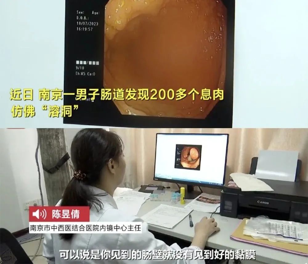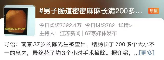 江苏南京,37岁的陈先生(化名)做肠镜检查,发现他的全结肠密布0.5~2.0cm大小不等的各类息肉,数量粗略估算有几百个。最后结果被确诊为“家族性腺瘤性息肉病”。