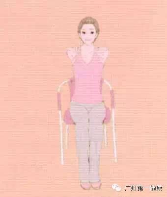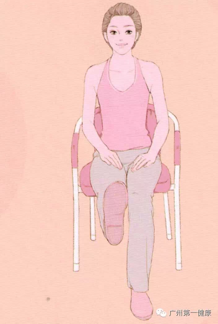 将意识集中在腿上,吸气,右腿向上抬起与地面平行,绷脚背或蹬脚跟,保持腹肌、大腿肌前侧收紧,在此姿势停留30秒,如果觉得累可将双手放在两侧椅背上。换上另外一条腿做相同练习,反复10次。