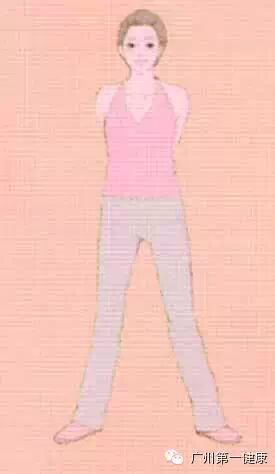 选择舒适的站姿,双腿分开略比肩宽,双手体后十指交叉,掌根夹紧。
