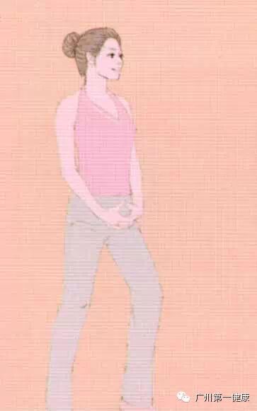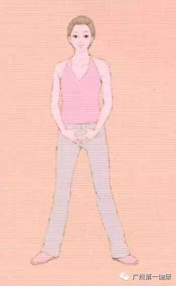 选择舒适的站姿,双腿分开略比肩宽,脚趾微微向外打开,十指体前交叉,拇指相对。