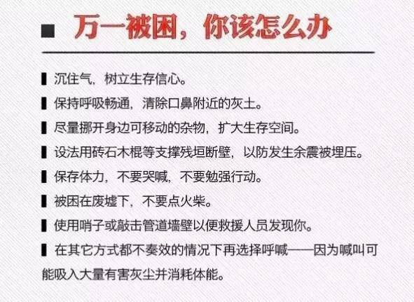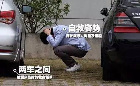 如果在停车场内或高楼附近,一定要马上下车,在两车之间的位置抱头蹲下,当建筑物倒塌的时候,两辆车之间的空隙可以成为你救命的空间。
