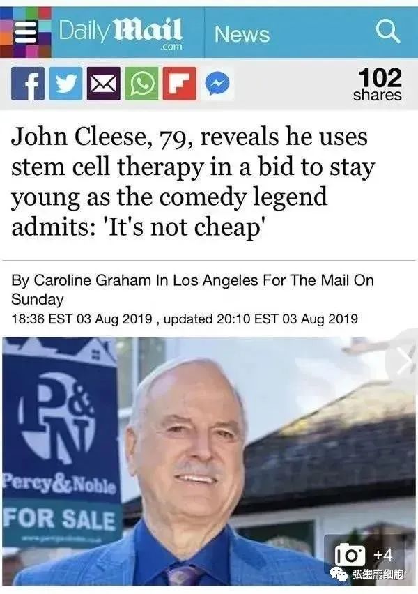 去年八月,英国发行量最大的《每日邮报》报道了英国喜剧大师约翰·克里斯(John Cleese)在80岁生日前参与英国DJ史蒂夫·赖特(Steve Wright)的BBC Radio 2节目《周日日落》(Hold The Sunset)录制时公开表示,他一直在使用干细胞疗法多年,以保持年轻并治疗老年带来的疼痛。