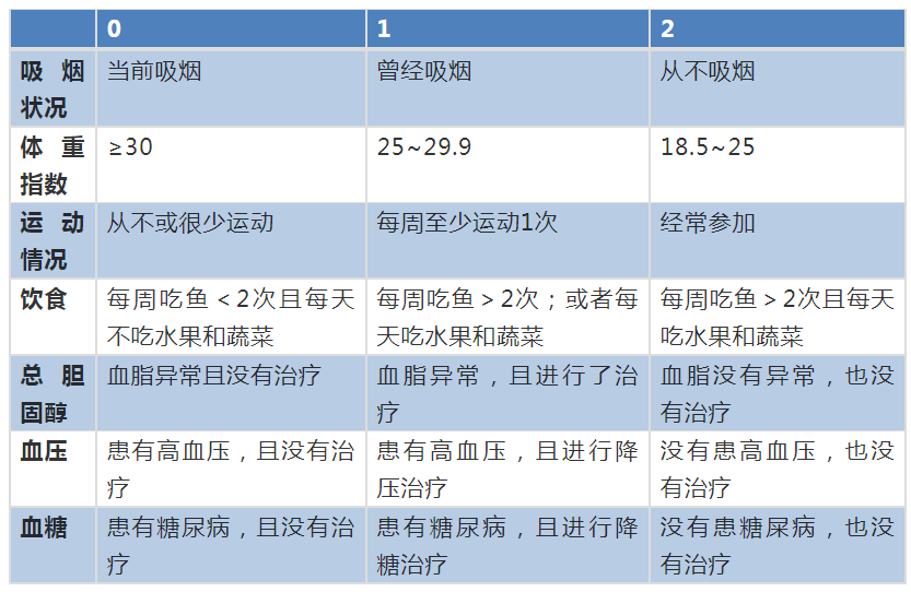 2010年,美国心脏协会(AHA)提出了“生命简单七法则”,根据7项指标评估心血管健康,分别为: