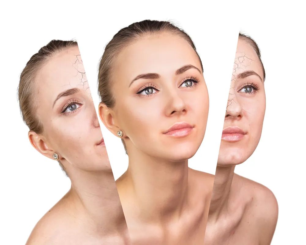 面部——皮肤松弛下垂、细纹增多、失去弹性、光泽,自我胶原蛋白不能再生,皮肤与脸部骨骼形成上下落;