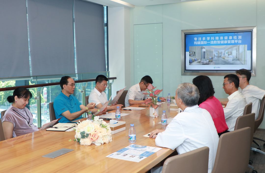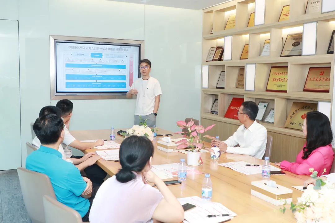 参观结束后双方举行了座谈会,梁冰副总裁首先代表第一健康对调研组一行的到访表示热烈欢迎,随后介绍了第一健康集团的发展历程、商业模式、核心竞争力及企业未来发展的规划和愿景,重点介绍了以健康数据采集为入口的一站式健康管理服务模式,以及注重“深检细管”的服务理念,目前在互联网技术领域持续创新突破,推动“数字化+智慧医疗”转型,致力于做中国领先的数智健康管理服务品牌。