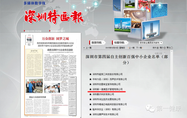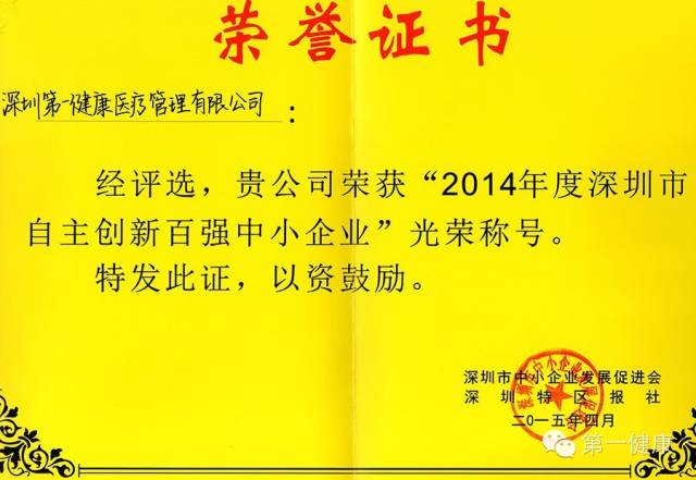 第一健康医疗管理有限公司在本次评选中脱颖而出,被评为“深圳市自主创新百强中小企业”。