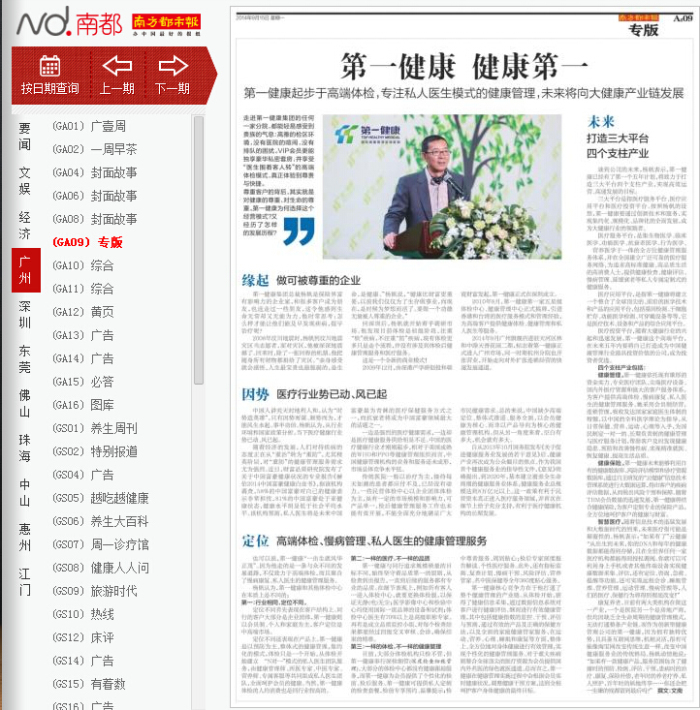 这是一个全新的商业模式! 2009年12月,由深港产学研创投和朝霞财富发起,第一健康正式在深圳成立。2010年8月,第一健康第一家五星级体检中心、健康管理中心正式揭牌,引进香港和台湾的医疗服务模式和管理经验,为高端客户提供健康体检、健康管理和私人医生等服务。2014年9月广州旗舰店进驻天河区林和中路天誉花园二期,标志着第一健康正式进入广州市场,同一时期杭州分院也开张营业,开始走向对外扩张连锁经营的快速发展通道。