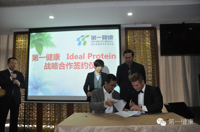 第一健康总裁杨帆先生与ideal Protein全球国际事业部总裁尼古拉斯·科辛先生签订合作协议。