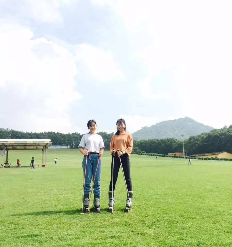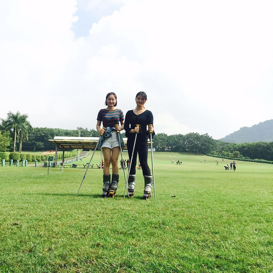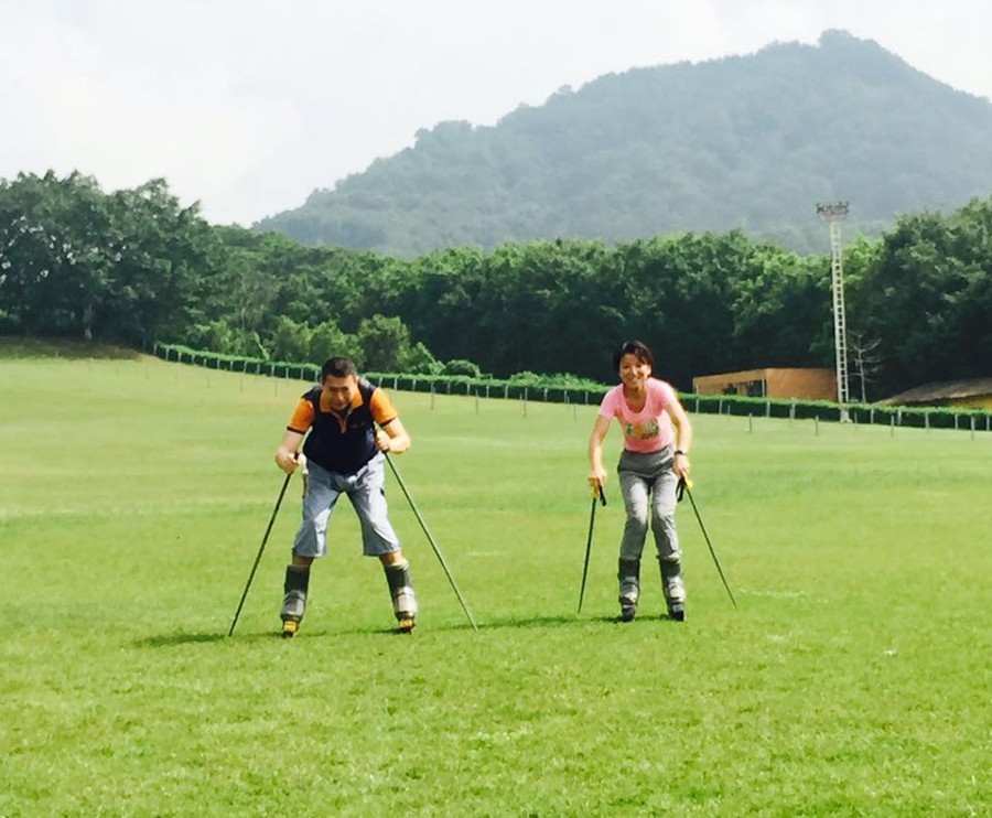 穿上沉重的滑草鞋,手持滑轮,撑起木杆,两腿张开,从坡顶滑下去,飞也似地,当一回草上飞,过把瘾也蛮有乐趣。