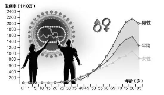2013年中国第一次发表了《肿瘤年报》,从下图中可以清晰地看出:第一,无论男女,癌症发病率从40岁以后就是指数增长;第二,老年男性比女性得癌症概率高,主要是前列腺癌。