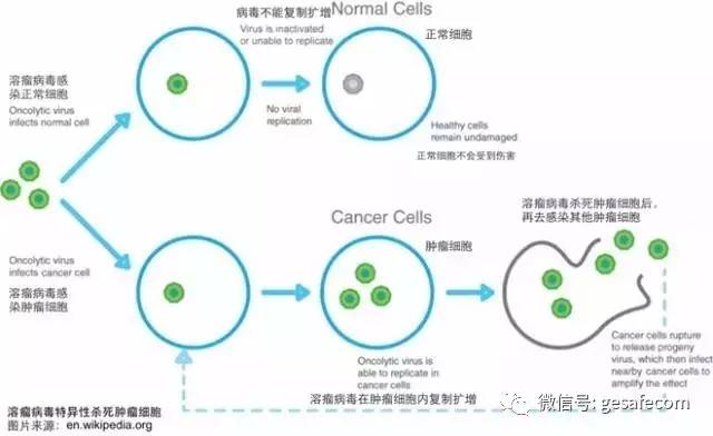 需要说明的是,溶瘤病毒也会感染正常细胞,只是因为各种原因,它们对正常细胞毒性弱很多。