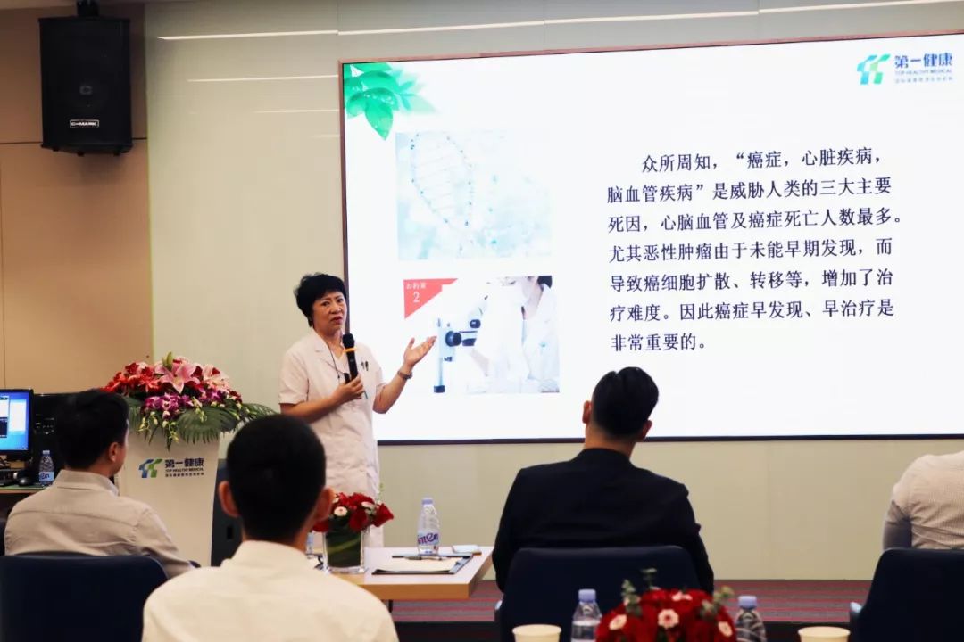 活动伊始,在观看完第一健康宣传片后,分别由第一健康集团深圳分公司副总经理张硕和医疗总监王东林分享了公司历史沿革,品牌理念,发展历程,第一健康十大健康管理中心、海外引进的日本项目及美国癌症预防项目。