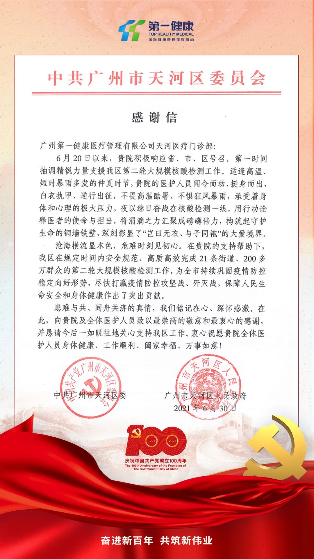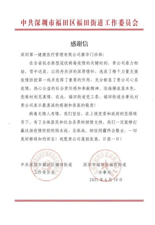 防控疫情是一场不能懈怠的赛跑,是一场比拼速度的较量。广州第一健康近日收到了中共广州市天河区委员会发来的感谢信,感谢天河区委和区政府对抗疫工作的赞赏和认可。纸短情长,一封薄薄的感谢信,既是对第一健康人的鼓舞,也激励着我们继续用实际行动,诠释“敬佑生命、救死扶伤、甘于奉献、大爱无疆”的崇高精神。在未来,将以此为动力,在天河区委、区政府的精密部署和科学指挥下,打赢战“疫”攻坚战,守护人民的生命健康!