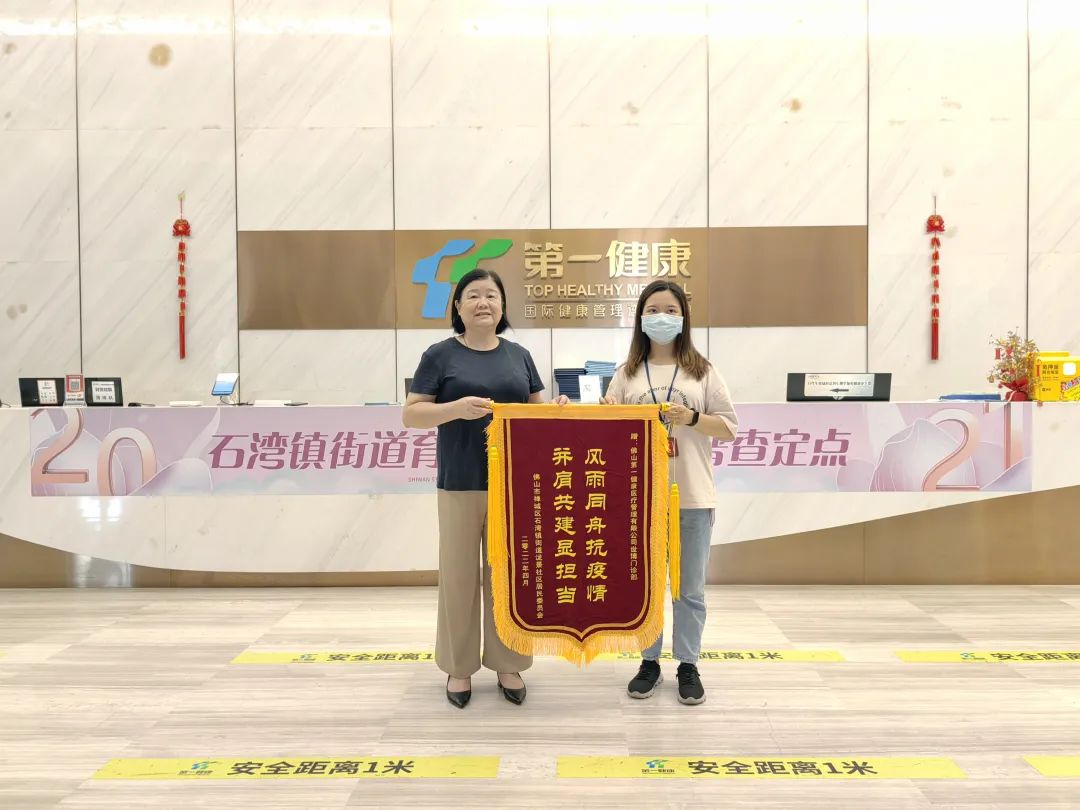 5月31日下午,石湾镇街道泷景社区居民委员会向佛山第一健康赠予“风雨同舟抗疫情 并肩共建显担当”的锦旗,以此感谢佛山第一健康为社区疫情防控作出的贡献。