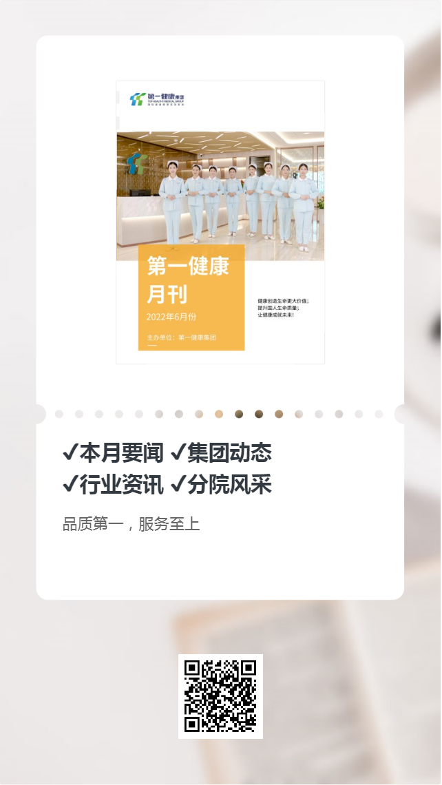 第一健康集团推出2022年6月份月刊(点击下图即可跳转),以便您更加了解我们的工作以及更好地监督我们提供优质的体检服务,同时也欢迎您提出宝贵的意见与建议。您的反馈是我们工作的动力,等候倾听您的声音。