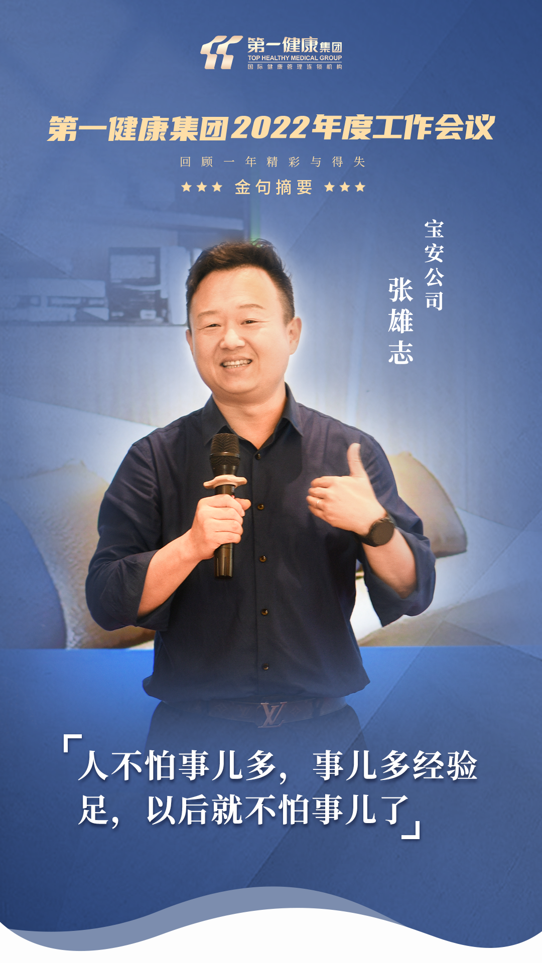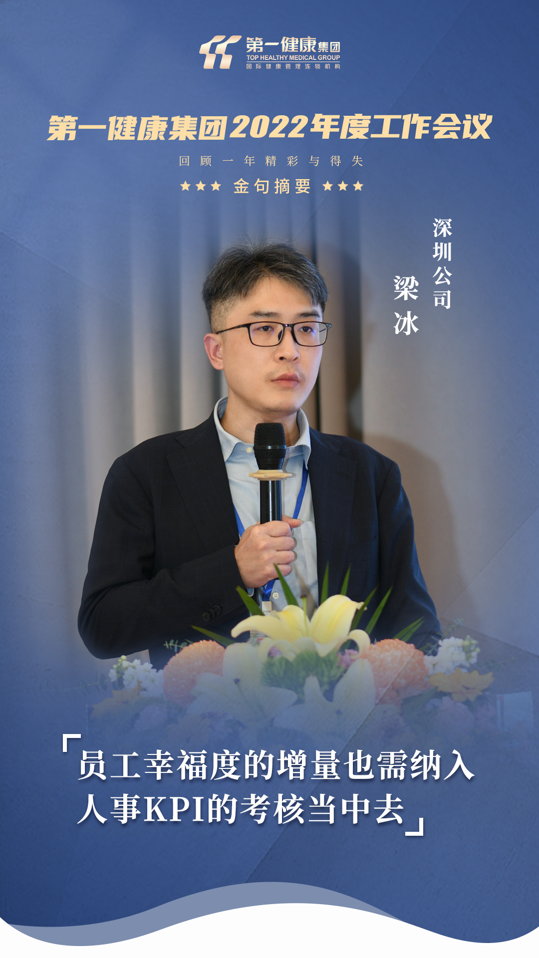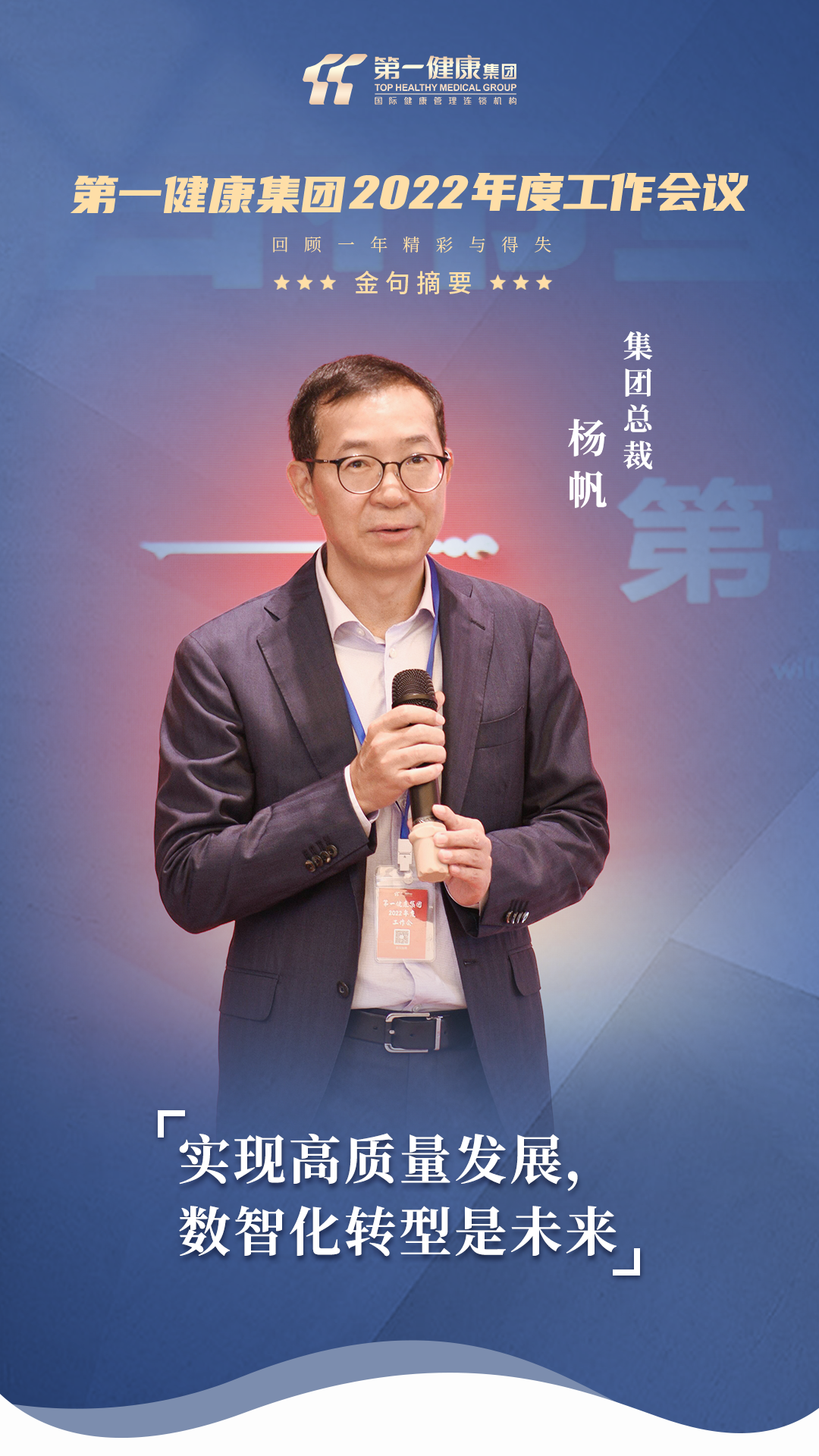 第一健康集团总裁杨帆先生以《重启希望,放飞梦想,共创未来》为主题做了重要发言,全面系统地总结了2022年集团主要工作,认为在新冠影响、市场竞争加剧等多重压力下,集团各项经营指标平稳增长,各项工作稳步推进,实现营收与利润正增长实属不易。过去一年,国家医疗健康相关政策等发生巨大的变化,去年12月防疫政策的调整,第一健康及时根据市民需求推出“阳康安心检”套餐等;启动数智健康云平台项目,推动“数字化+智慧医疗”转型;实现与深圳三甲公立医院检验结果互认,节约会员和国家医保费用,严格把控医疗质量关......通过盘点和回顾,杨帆总裁实事求是地肯定了一年来每位第一健康员工的工作成果,总结了存在的问题与不足,更加明确了2023年努力的方向和要实现的目标,对2023年工作做出了部署,明确提出“实现高质量发展,人才储备是第一要素,品质服务精细化是基础,数智化转型是未来”,要求紧抓医疗质量核心,提升服务品质,打造优质医疗健康品牌。新的一年,让我们继续扬帆远征,全新出发!