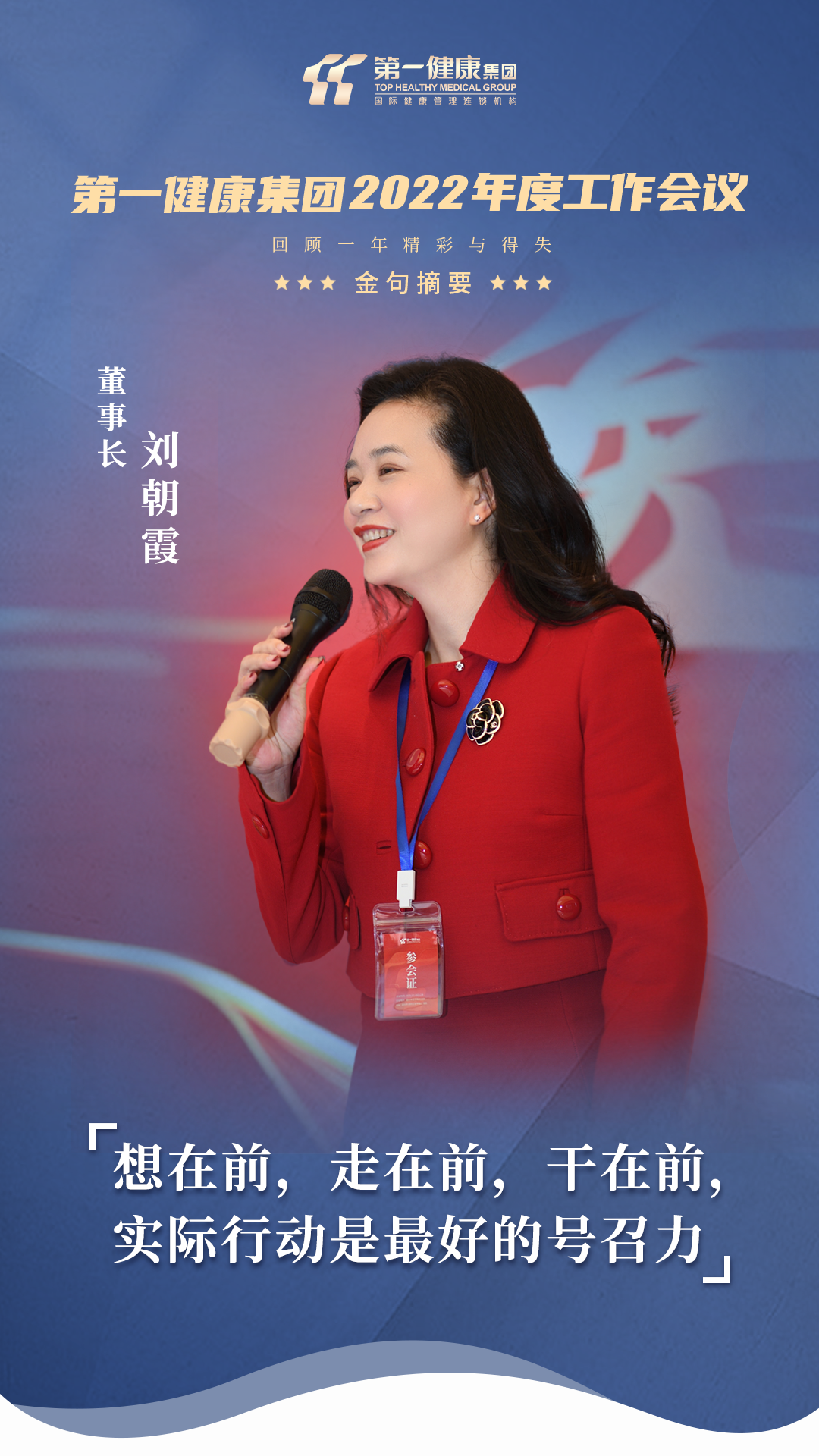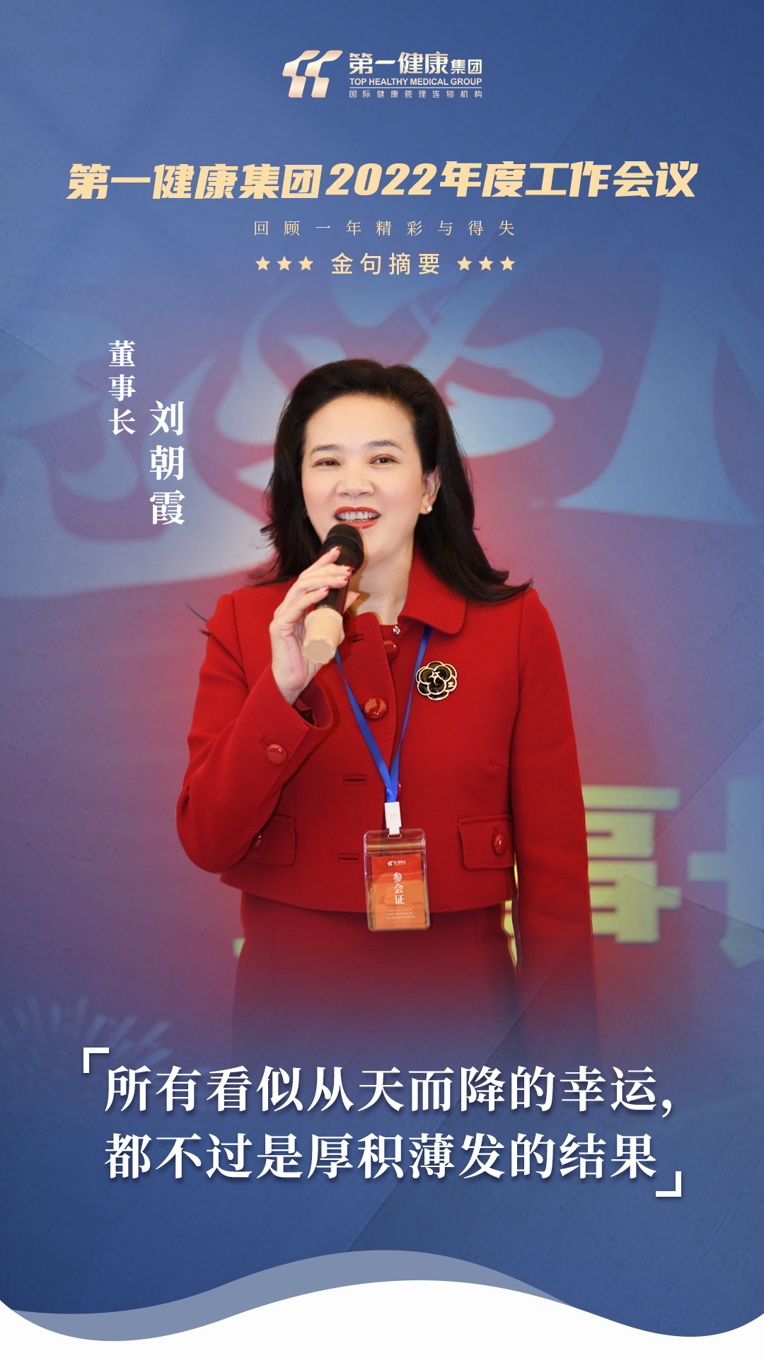 会议最后,第一健康集团董事长刘朝霞女士发表了重要讲话,提出三点“选择比努力更重要”“信心比黄金重要”“行动比想法重要”,鼓励大家在工作中要坚信自己的选择,踏出自信的步伐,以新的面貌迎接挑战。2022年各项工作均取得了很好的成绩,她对未来的工作提出新的希望,激励大家在2023年要有不达目标、不罢休的心态,并坚信在新的奋斗征程上,在全体同仁的共同努力下,第一健康集团的发展一定能创造新的辉煌!刘朝霞董事长的讲话宛如一根定海神针,让参会的每一个人都能更加明确自己今后工作的方向,以乐观的心态来迎接新一年的机遇和挑战。