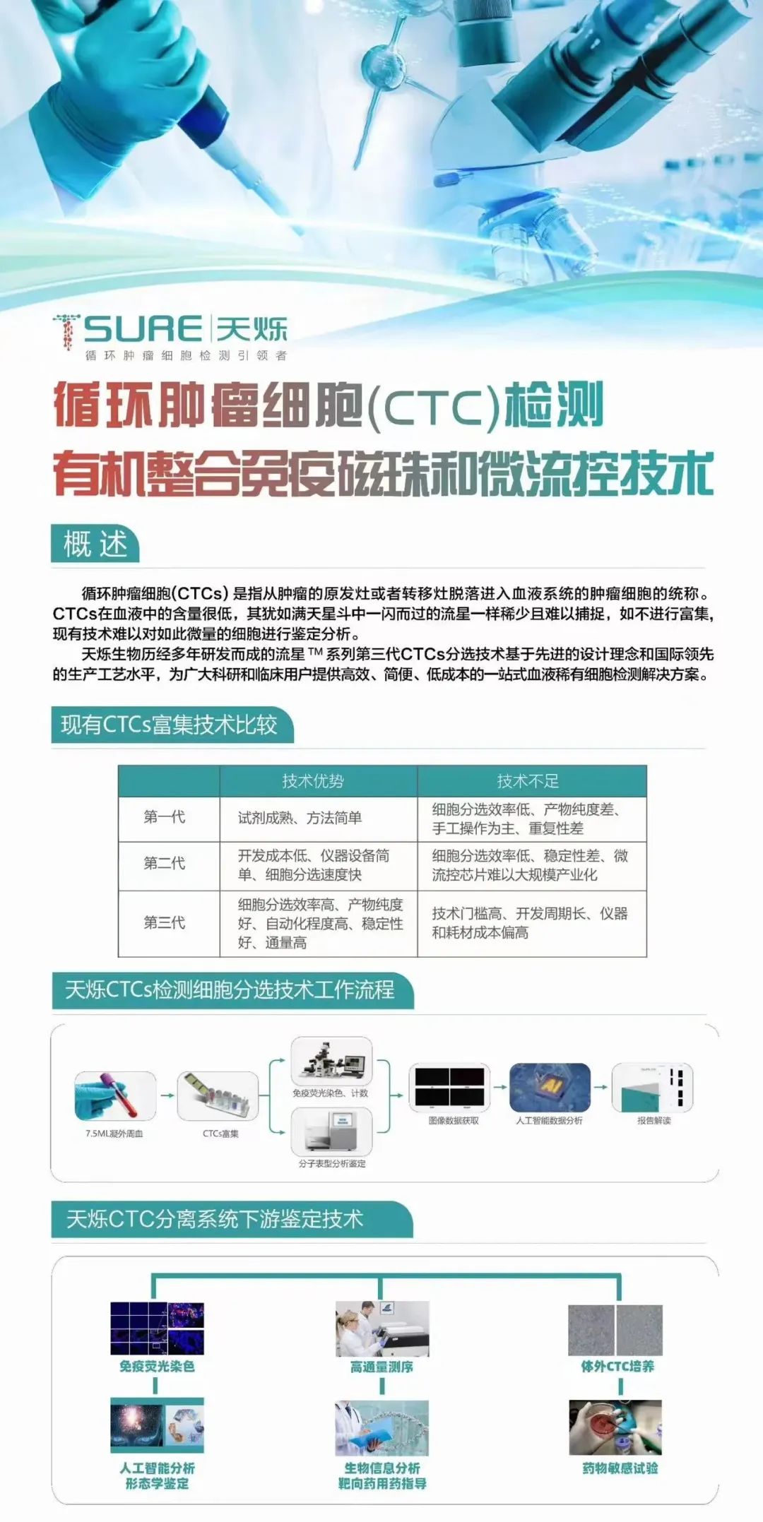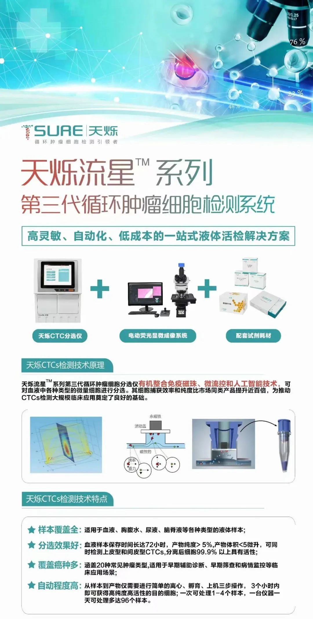 天烁生物是循环肿瘤细胞CTC检测的引领者,其CTC捕获效率、产物纯度、检测的准确率、稳定性以及覆盖的癌症种类等核心技术指标均位居世界前列,不仅能够用于已确诊癌症患者的精准治疗和病情监控,更适合用于癌症早期诊断、早期筛查,为早期发现癌症提供一种准确、安全、便捷的手段。