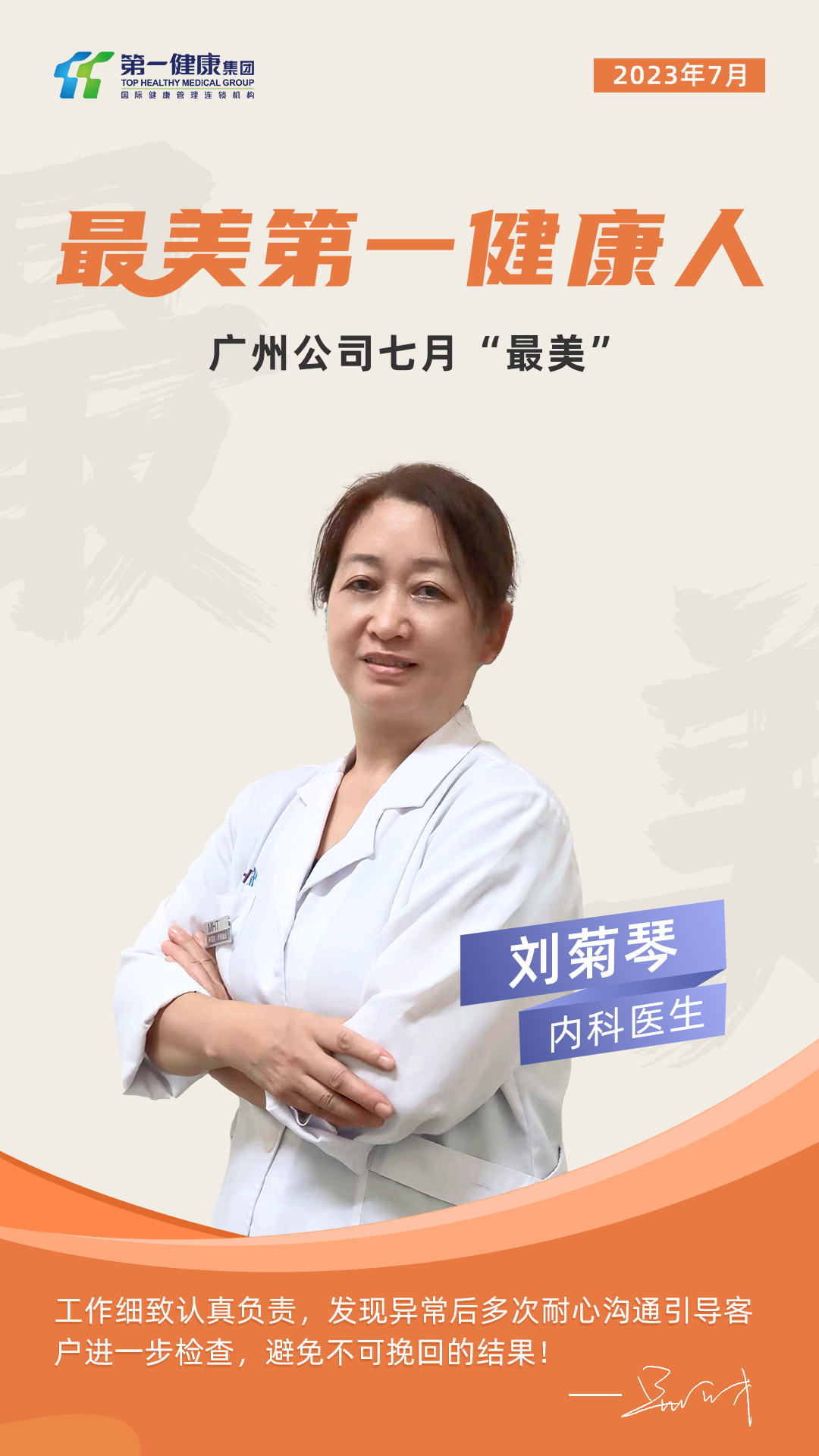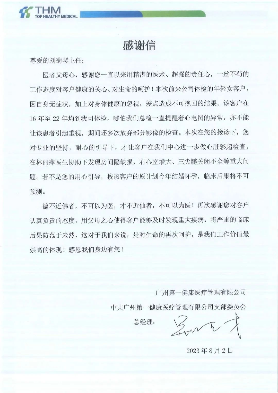 “感谢您对客户认真负责的态度,用父母之心使得客户能够及时发现重大疾病,讲严重的临床后果防范于未然,这对于我们来说,是对生命的再次呵护,是我们工作价值最崇高的体现。”2023年8月2日,广州第一健康收到体检客户写给刘菊琴主任的一封感谢信。